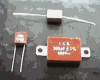 Moulded Mica CapacitorsThe units with terminals are moulded with electronic grade epoxy. The process used is that the units are placed in specifically designed mould boxes and liquid epoxy is poured into these boxes. These are then cured in air circulating ovens. The resultant product is a hard epoxy coated capacitor. This is specially needed where the terminals are of axial version, which cannot be dip coated, and also for very high voltage transmitting type capacitors. |